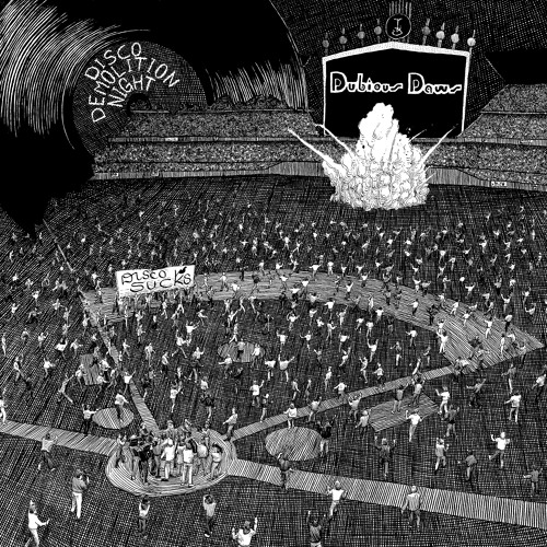 Disco Demolition Night at Comiskey Park with explosion, crowd on field, and "Disco Sucks" sign