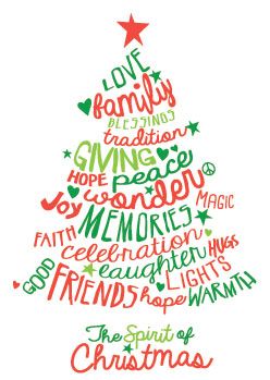 Illustration of Christmas tree comprised of words in shades of red and green. The trunk has the words "The Spirit of Christmas" with the tree topped with a red star and comprised of the words LOVE, FAMILY, BLESSINGS, TRADITION, GIVING, HOPE, PEACE, WONDER, JOY, MEMORIES, MAGIC, RAITH, CELEBRATION, LAUGHTER, HUGS, LIGHTS, GOOD FRIENDS, WARMTH